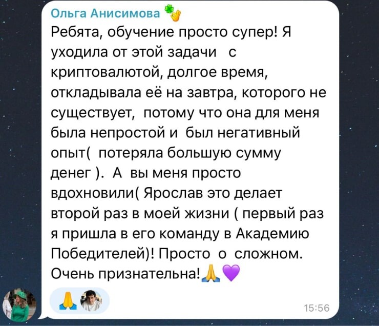 Мы не хотим бросать вас после тренинга. После 2-дневного обучения с практикой у вас будет персональный консультант от компании WISY, который будет сопровождать вас 30 дней по всем вопросам о мире криптовалют. Для нас важно, чтобы каждый клиент был доволен качеством и сервисом наших услуг